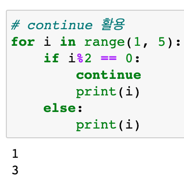 continue는 해당 loop를 건너뛰고 다음 loop로 가는 역할을 수행합니다. 따라서 왼쪽 결과를 보면 2의 배수일 때 값을 print하지 않고 다음 loop로 넘어가는 것을 확인할 수 있습니다.