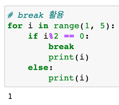 break는 반복문을 벗어나는 역할을 합니다. 왼쪽 결과를 보면 i 값이 2일때 조건에 맞아 break를 만나고 반복문을 벗어나 이후의 값이 출력되지 않는 것을 확인할 수 있습니다.