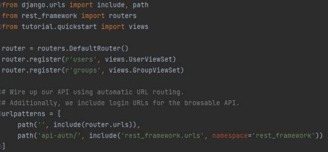 튜토리얼에서는 views가 아닌 viewsets을 사용하고 있기 때문에 위에 보이는 것과 같이 쉽게 router class와 함께 API URL을 등록할 수 있습니다.
