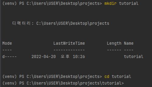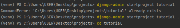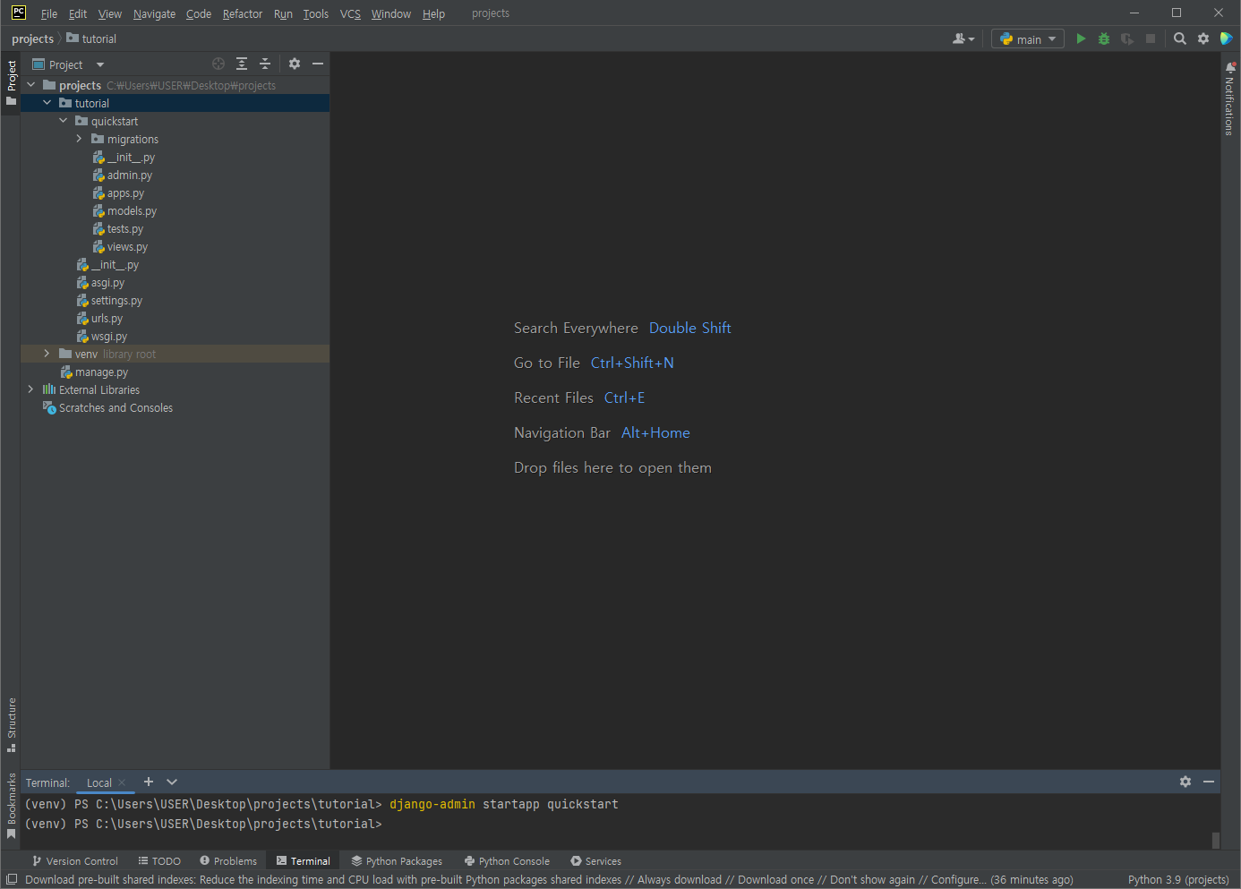새로운 장고 프로젝트 tutorial을 생성하고 quickstart라는 app을 만들어 보겠습니다.