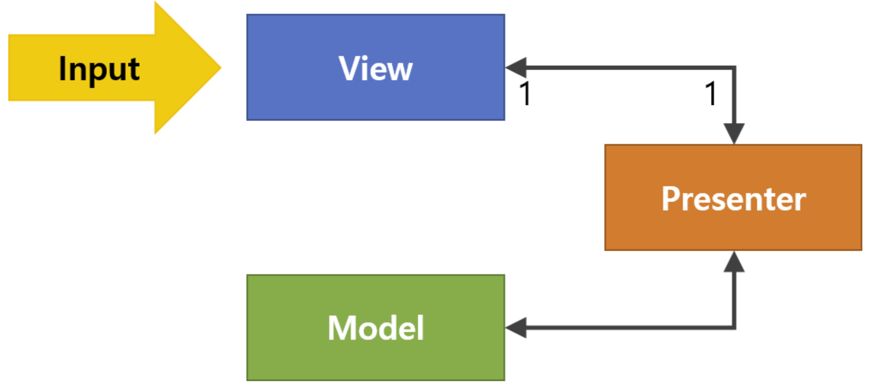 | 특징 | - 모든 입력은 뷰로 전달, Presenter가 모델 업데이트 - Presenter가 뷰와 모델 사이 매개체 역할 - 뷰와 Presenter 의존성 문제 |