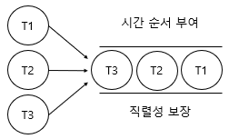 - DBMS가 부여하는 timestamp를 활용하여 트랜잭션의 처리 순서를 구분하는 방법 - 논리적 계수기 또는 시스템 클럭 활용 timestamp 생성 |