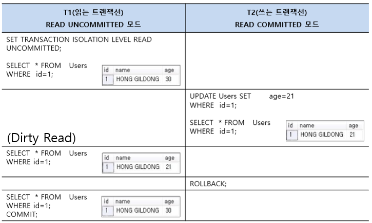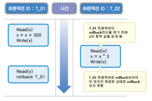 - 두 트랜잭션이 동일한 데이터에 접근할 때, 한 트랜잭션이 데이터 갱신 후 Rollback 수행하는데 그 사이에 다른 트랜잭션이 해당 데이터를 읽어 사용할 때 발생하는 문제 |