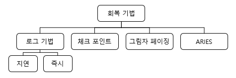 | 로그 기법 | - 갱신 결과를 로그 파일에 저장 - 장애 발생 시 로그 기반 회복 수행 |