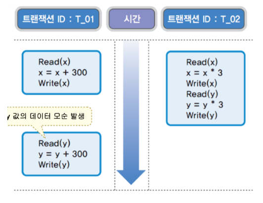 - 트랜잭션이 특정 데이터를 갱신하는 동안 다른 트랜잭션이 값을 읽어와 갱신된 후의 값을 읽게 되는 문제 - 데이터의 불일치 (모순성)이 발생 |
