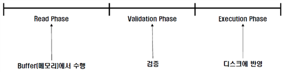 - 트랜잭션 수행 동안은 검사하지 않고 종료 시에 일괄적으로 검사하는 방법 - Read 단계, Validation 단계, Write 단계로 구분 |