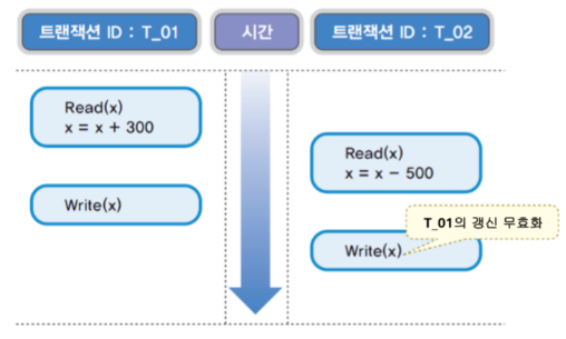 - 하나의 트랜잭션이 갱신한 내용을 다른 트랜잭션이 덮어씀으로써 갱신이 무효화되는 문제 - 두 개의 트랜잭션이 한 개의 데이터를 동시에 갱신할 때 발생 |