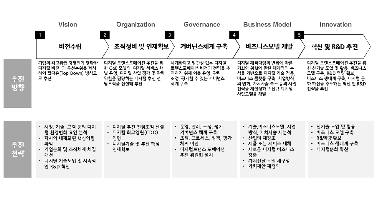 | 비전 수립 | 비즈니스 환경 분석 | 시장, 기술, 고객 등 디지털 변화 요인 분석 |