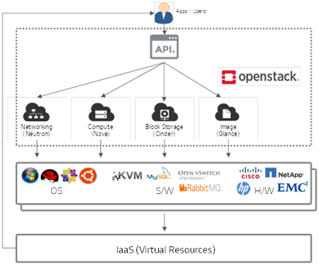 - CPU, 메모리, 스토리지, 네트워크와 같은 자원들을 제어하고 운영하는 IaaS 클라우드 오퍼레이팅 시스템