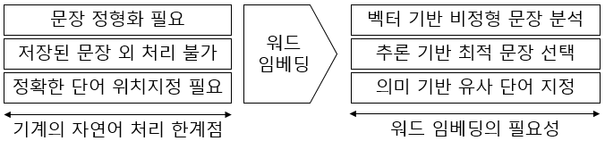 | 방식 | 단어-문서 내 중요도 산출 | 단어를 벡터 매핑 후 추론 |