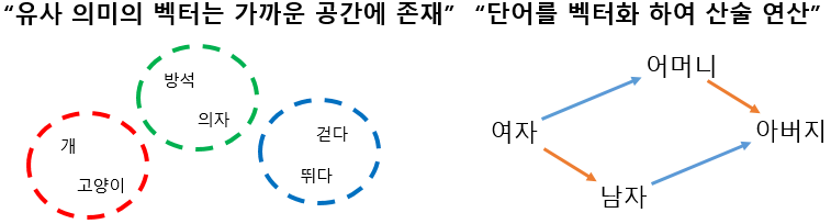 | 연산 대상 | 문서 내 단어 등장 횟수 연산 | 단어 벡터 간 관계 연산 |