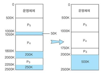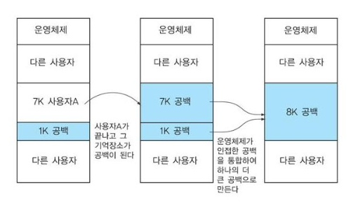 | 개념 | - 인접한 단편화 영역을 찾아 하나로 통합 | - 메모리의 모든 단편화 영역을 하나로 압축 |