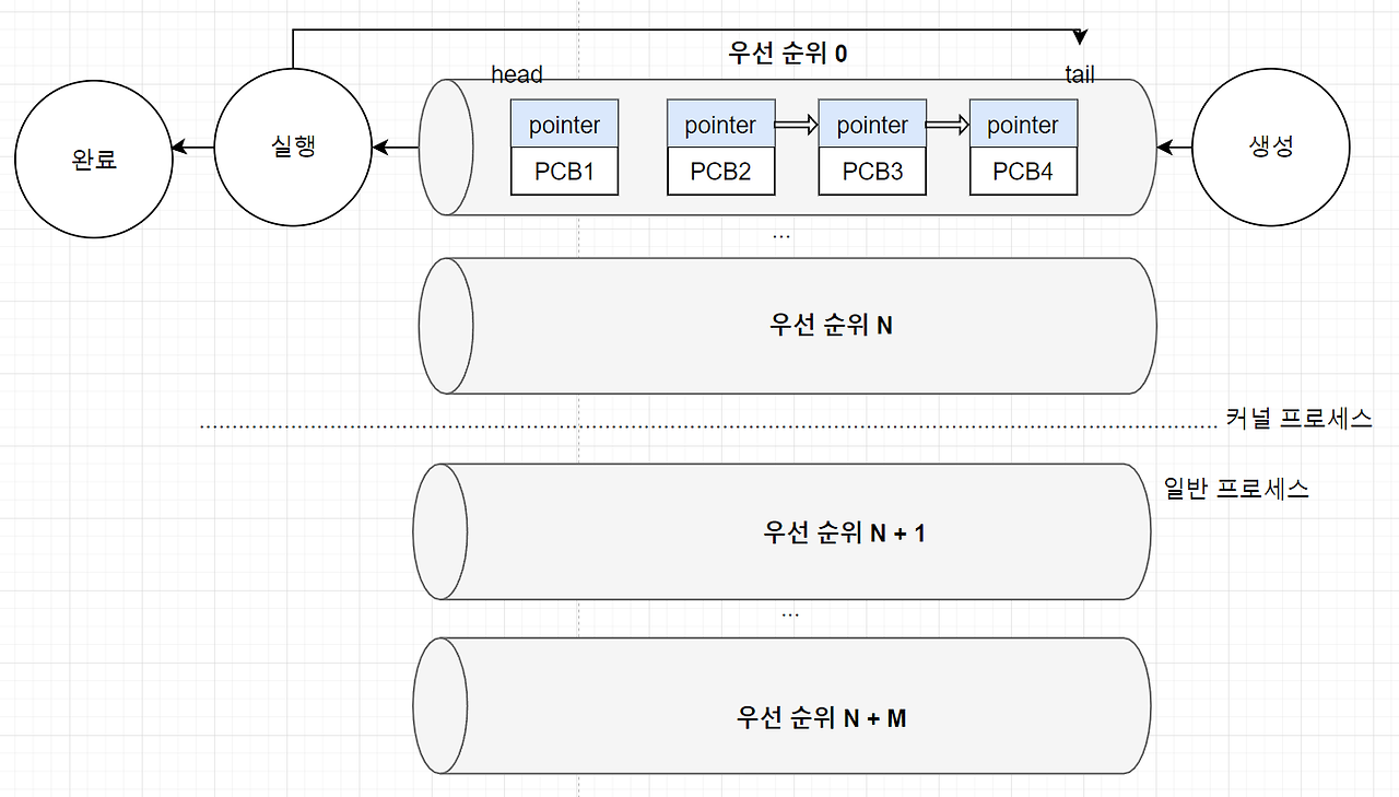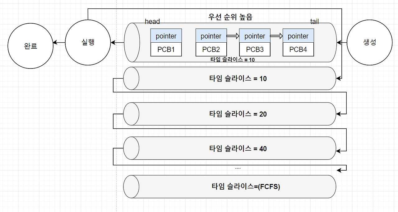 - 프로세스 큐에 서로 다른 타임 슬라이스 부여 - 타임 슬라이스 소진 프로세스는 하위 큐로 이동 |
