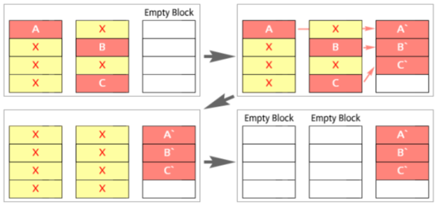 | - Garbage Collection: 무효화된 페이지 포함하는 블록 선택하여 유효한 페이지는 다른 블록에 복사 후 블록 삭제 | ||