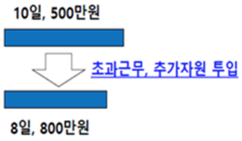 - 프로젝트 수행 중 범위의 변경 없이 일정을 단축시켜야 할 상황에 사용하는 일정 및 자원을 활용한 일정 단축 기법