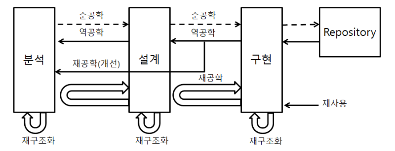 | 역공학 | 소프트웨어 분석 | - 기존 SW 내부 구조 분석 |