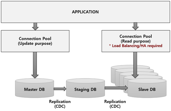 - Master, Staging, Slave 3개의 DB와 CDC 복제 기술로 구성