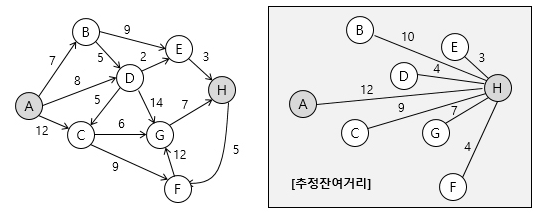 - 시작점에서부터 현재 정점까지의 최단거리와 현재 정점에서 목표점까지의 추정잔여 거리를 활용해 최단거리 구하는 알고리즘
