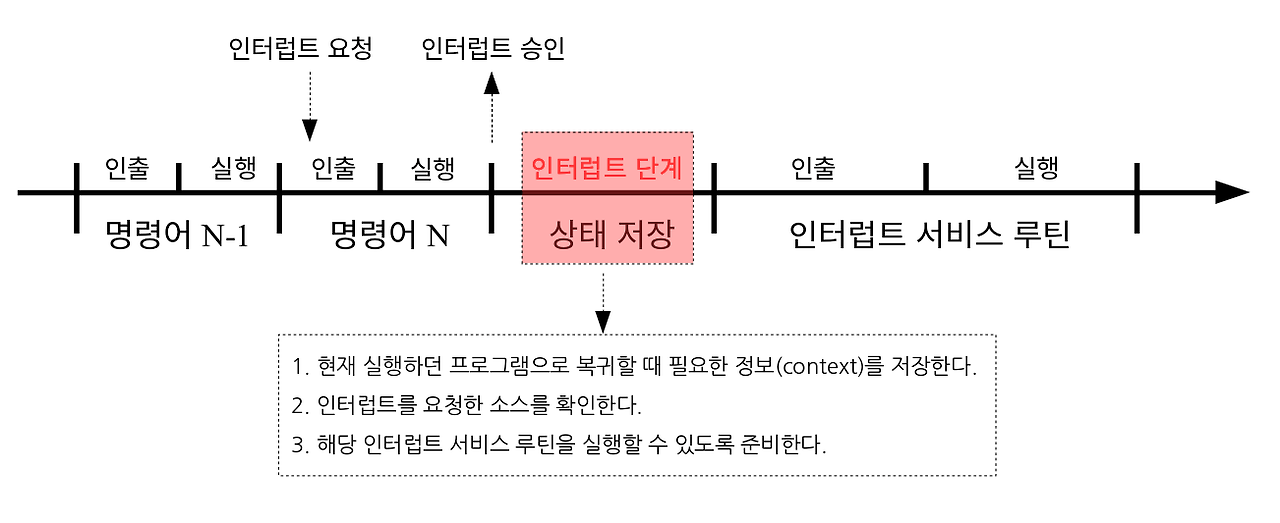 | 인터럽트 우선순위 판단 | 마스킹 여부와 우선순위 판단하여 처리 여부 결정, 처리 승인 시 현재 작업 중단 | |